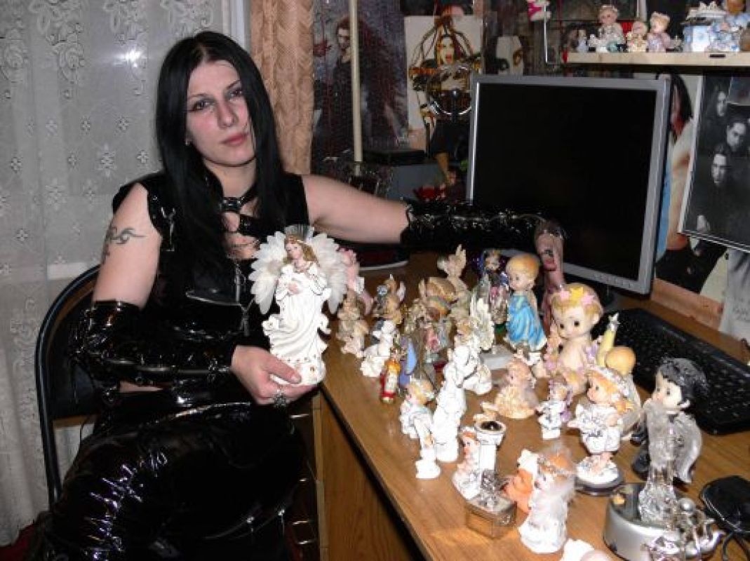 Любовь к ангелам никак не мешает другим увлечениям девушки. По соседству с ангельскими созданиями висят плакаты рок-групп, под потолком парит летучая мышь, на столе бесчисленное множество шипованных браслетов.
