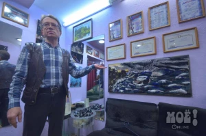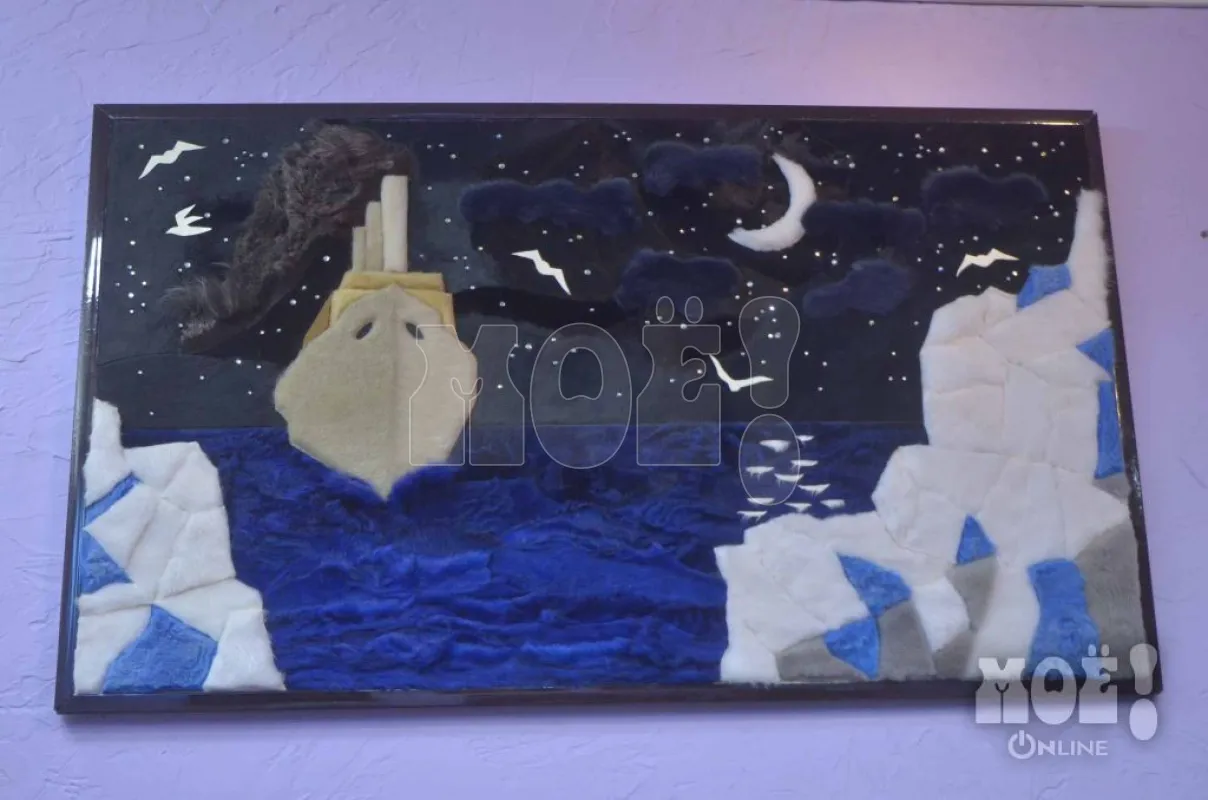 — У меня было множество отходов меха от синей каракульчи, — рассказывает Сергей Тимофеев. — Я подумал — что может быть синим? Например, море. И я решил попробовать. Так родилась самая первая картина «Титаник». Потом стал усложнять себе задачу: сделать не просто спокойное море, а море в шторм. Нужно было передать множество переходов цвета, поэтому я сделал сначала набросок акварелью. Потом сверху постепенно все заклеил мехом — появилась картина «Шторм».