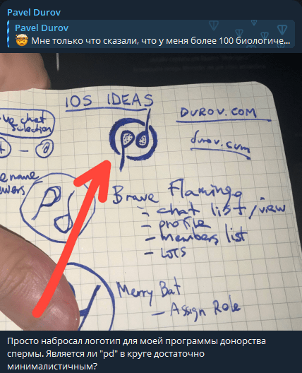 В личном телеграмм-канале Павел Дуров показал набросок логотипа для программы донорства спермы.