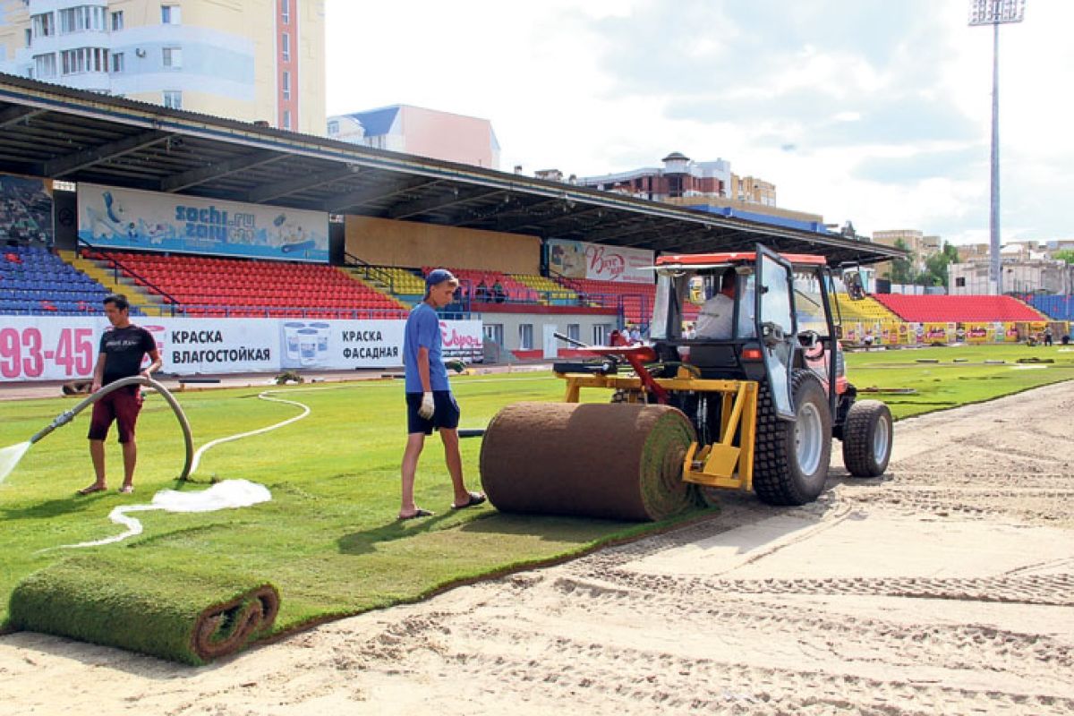 Однако работы по обустройству футбольного поля затянулись. Свои коррективы внесла погода. Дожди задержали один из основных этапов — выемку грунта на глубине более полуметра. Поэтому в обозначенные сроки посадить «родной» газон попросту не успели. Чтобы не затягивать процесс ещё больше и не ждать, когда на поле вырастет своя трава, было принято решение вырастить футбольный газон отдельно — на специальной плантации в Волгоградской области. А после того, как он был готов, специалисты срезали его и в виде массивных рулонов привезли в Тамбов.